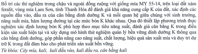 Nghiên cứu cân bằng dinh dưỡng Kali cho mía đồi vùng Lam Sơn Thanh Hóa.(TS. Phạm Thị Thanh Hương)